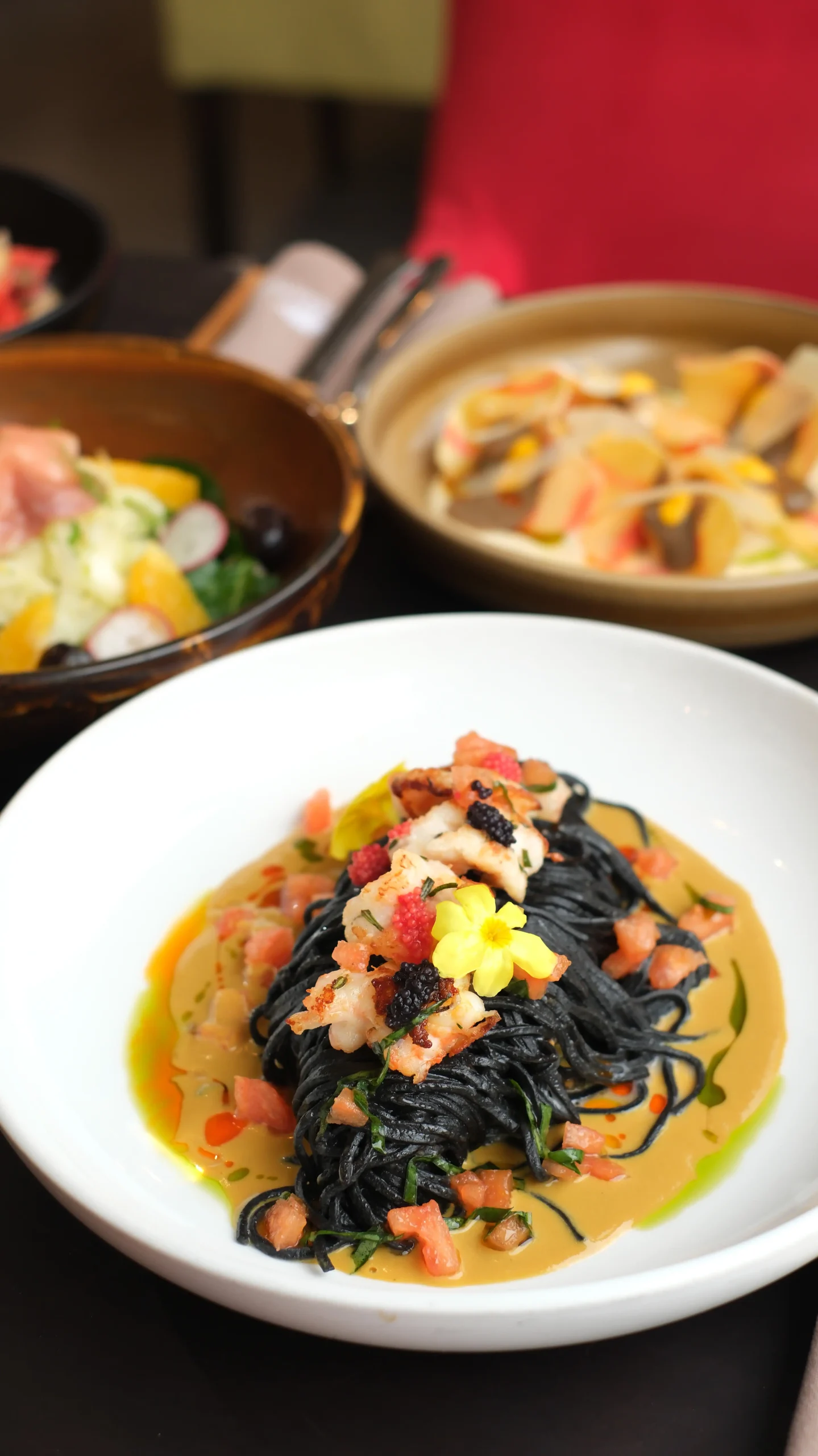 Homemade squid ink tagliolini with shrimps, red salmon haviar and sea sauce